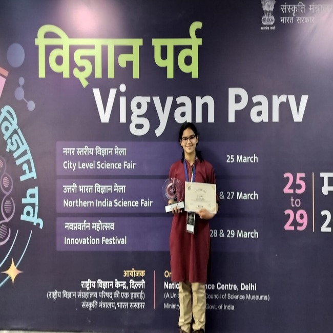 Swarnima Bist of Class XD brought recognition to the School by securing the Second Prize in the Arts category at this esteemed event. Competing alongside talented students from different institutions, she demonstrated exceptional creativity and originality. Swarnima participated with an impressive artwork developed under the theme “Viksit Bharat”. Her creation vividly depicted the vision of a developed and progressive India, effectively combining artistic expression with a meaningful message. The artwork was widely appreciated for its depth, clarity of concept, and aesthetic excellence.