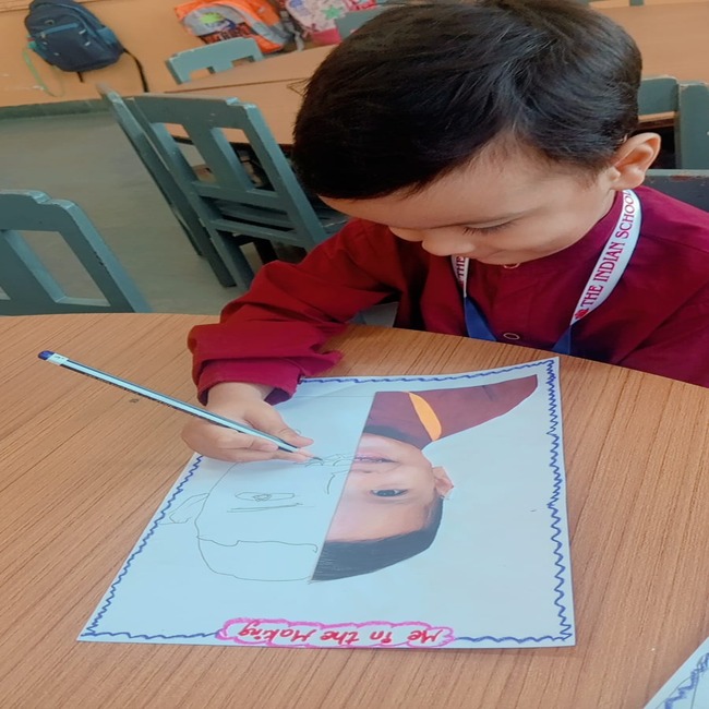 The activity titled “Me in the Making- My Self-Discovery Journey” introduced a unique and imaginative dimension. Each child was given a sheet depicting half his or her face and were invited to complete the other half. This exercise not only stimulated observation and creativity but also encouraged the children to connect with, and express their emerging sense of identity.
